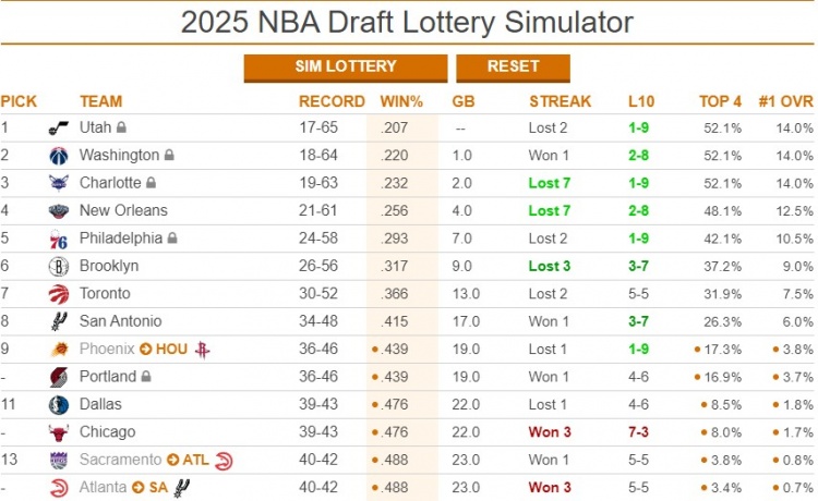 今年的14支乐透球队也全部出炉,分别是爵士、奇才、黄蜂、鹈鹕、76人、篮网、猛龙、马刺、太阳、开拓者、独行侠、公牛、国王、老鹰。