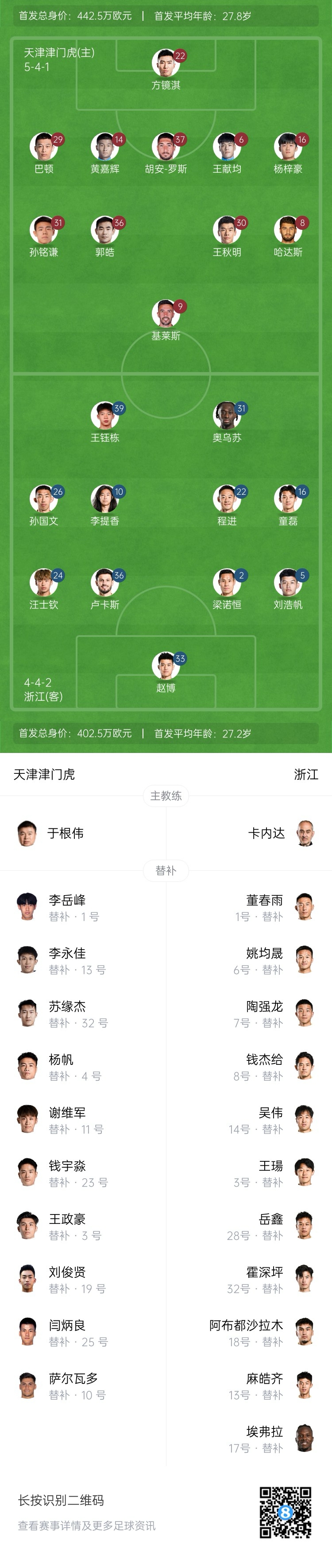 津门虎vs浙江首发:3外援PK2外援!基莱斯先发,王钰栋、童磊出战