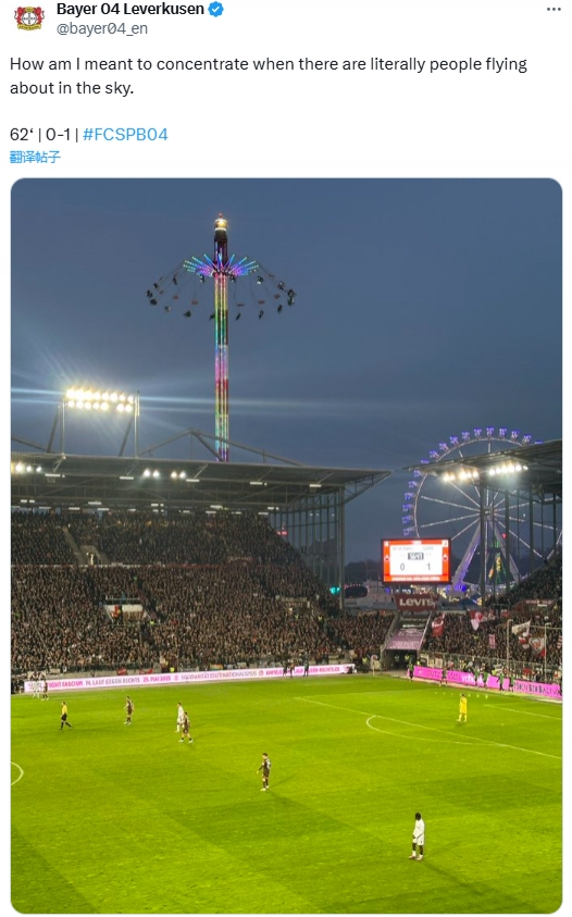 圣保利主场附近有游乐园,勒沃库森英语官推晒照并发文:当天上有人飞来飞去的,我该怎么集中注意力呢?(药厂发文时球队1-0领先,但最终被扳平)
