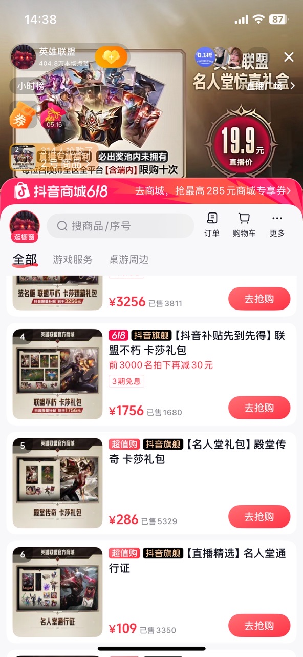 根据目前抖音英雄联盟官方直播间销量显示,最高档位3256元臻藏礼包已售3811套,第二档1756元联盟不朽礼包已售1680套,第三档286元殿堂传奇礼包已售5329套,109元Uzi名人堂通行证已售3350套,共计1694.5540万元。