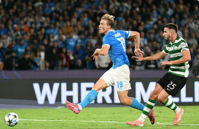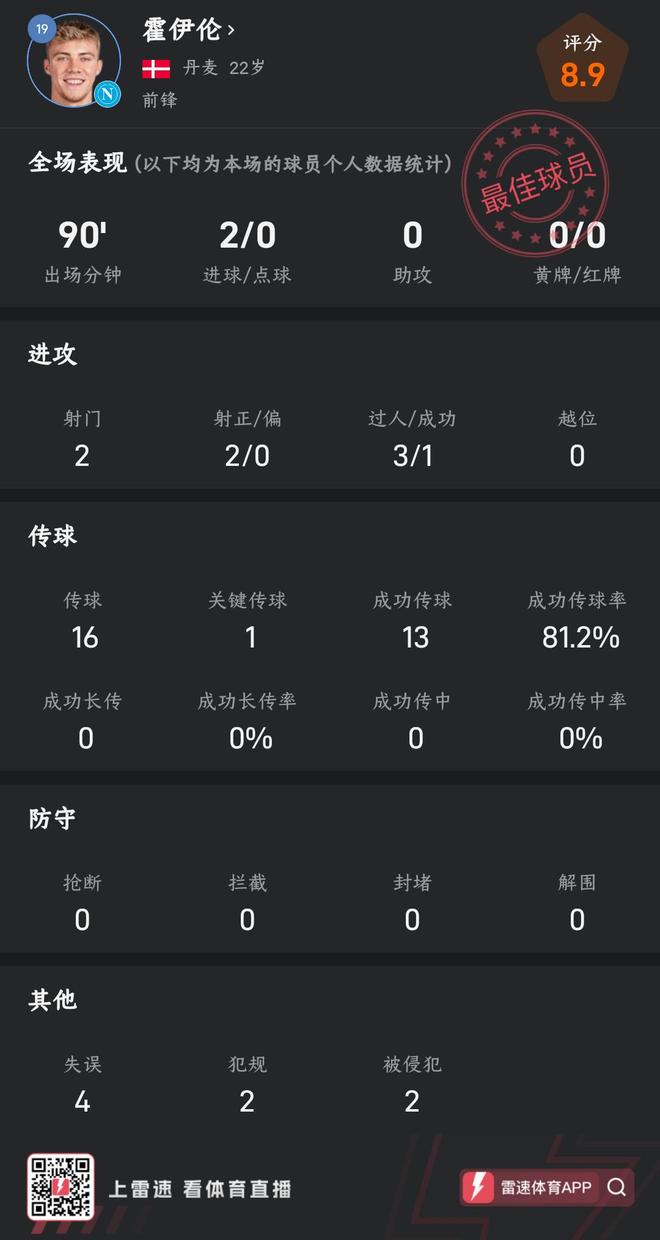 雷速体育10月02日宣 25-26赛季欧冠联赛阶段第二轮,意甲冠军那不勒斯坐镇主场2-1战胜葡超冠军葡萄牙体育,从而夺取本赛季欧冠首场胜利。那不勒斯能斩获胜利,丹麦前锋霍伊伦发挥了决定性作用,包办球队全部2粒入球。