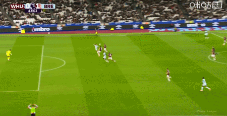 第43分钟,沙德助攻,蒂亚戈射门得分,布伦特福德1-0西汉姆联