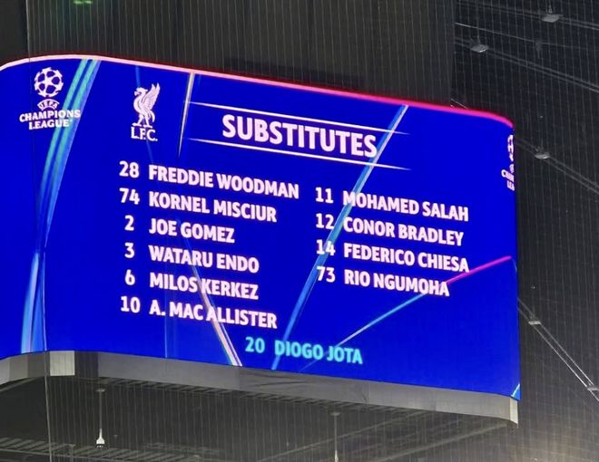 雷速体育10月23日宣 欧冠联赛阶段第三轮,利物浦客场挑战法兰克福。半场结束利物浦3-1领先法兰克福。比赛中出现暖心一幕,法兰克福主场的大屏幕显示利物浦替补球员时,加入了今夏不幸离世的若塔的名字。