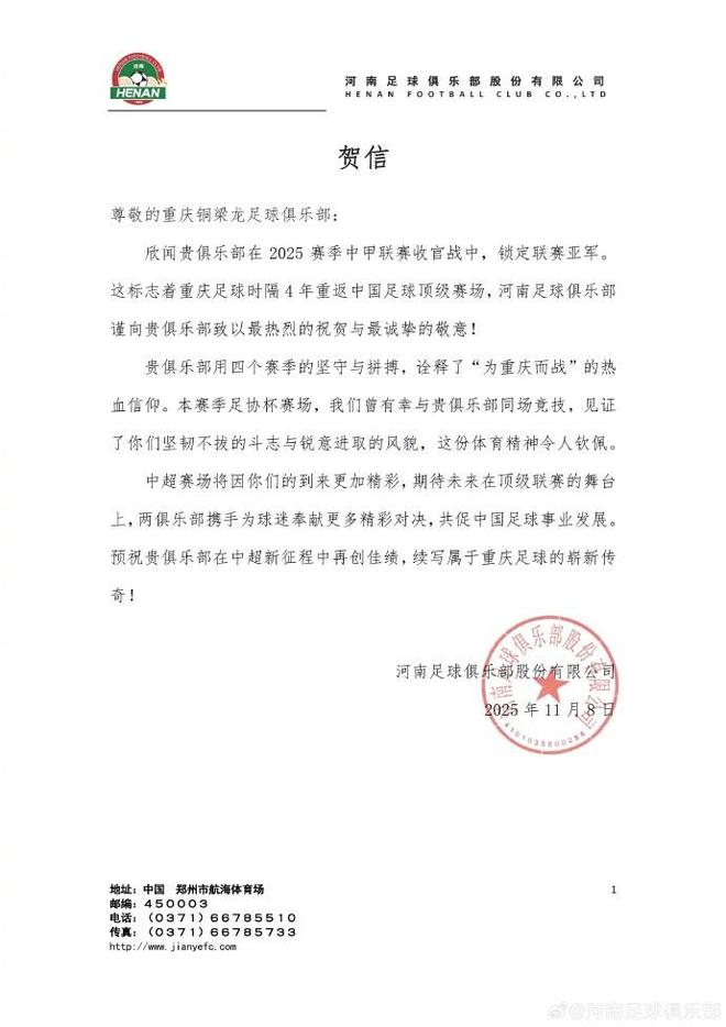 欣闻贵俱乐部在2025赛季中甲联赛收官战中,锁定联赛亚军。这标志着重庆足球时隔4年重返中国足球顶级赛场,河南足球俱乐部谨向贵俱乐部致以最热烈的祝贺与最诚挚的敬意!