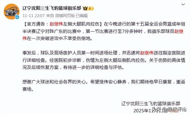 根据辽宁男篮官方的公示,在今晚进行的第十五届全运会男篮成年组半决赛辽宁对阵广东的比赛中,第一节比赛进行至7分多钟时,我俱乐部球员赵继伟在一次突破进攻中不幸受伤倒地。
