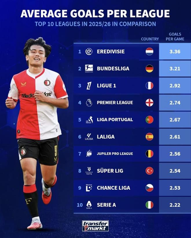 欧洲联赛场均进球数发布!意甲的进球数甚至不如小联赛排名垫底