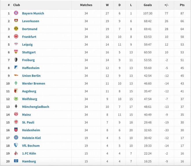 拜仁联赛唯一一负发生在今年3月,他们在主场2-3爆冷不敌波鸿。拜仁在34场比赛里拿到了87分,比第二名的勒沃库森多了21分。