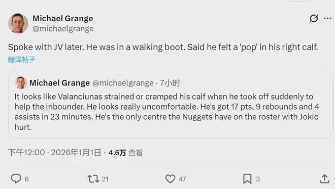 第三节瓦兰右小腿拉伤,一瘸一拐走到场边,提前退出比赛。NBA记者Michael Grange报道,瓦兰丘纳斯表示,自己听到一声“砰”的异响,赛后穿上了保护靴。更扎心的是,掘金这几个伤员都不是小伤,至少缺席一个月以上。