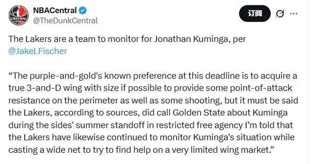 名记Fischer近日报道称,湖人一直在密切关注着库明加,且早在去年夏天便致电勇士询问过相关情况。