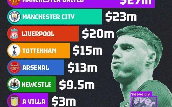 英超球衣衣袖广告收入排行榜:曼联第一,阿森纳仅第五